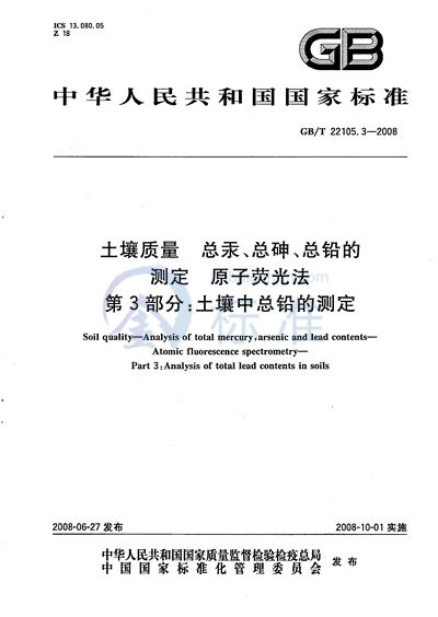 标准名称:土壤质量 总汞、总砷、总铅的测定 原子荧光法 第3部分:土壤中总铅的测定